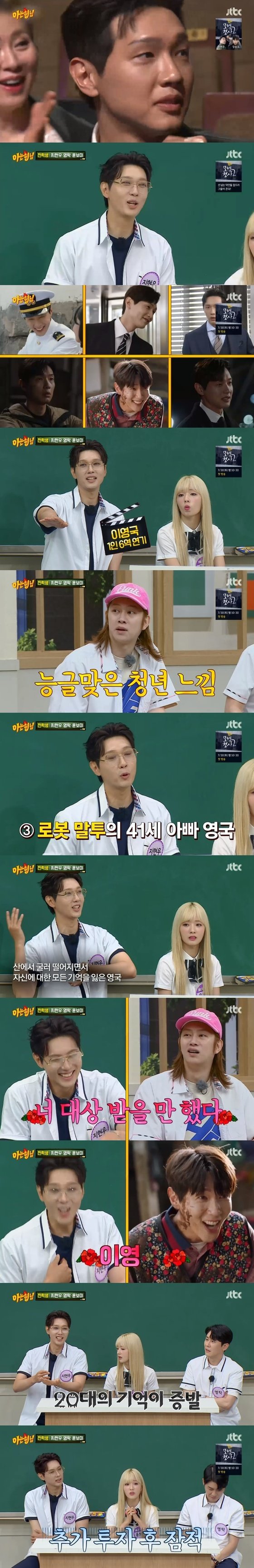 영탁이 "1인 다역을 하면 출연료를 몇배로 주냐"라고 묻자 지현우는 "그런 것은 전혀 없다"라고 답했다. 그러면서 "22살 이영국까지는 이야기가 됐는데 그 후로 기억 상실이 잦았다"라면서 "어떻게 연기해야 하지(걱정했다)"라고 말했습니다.