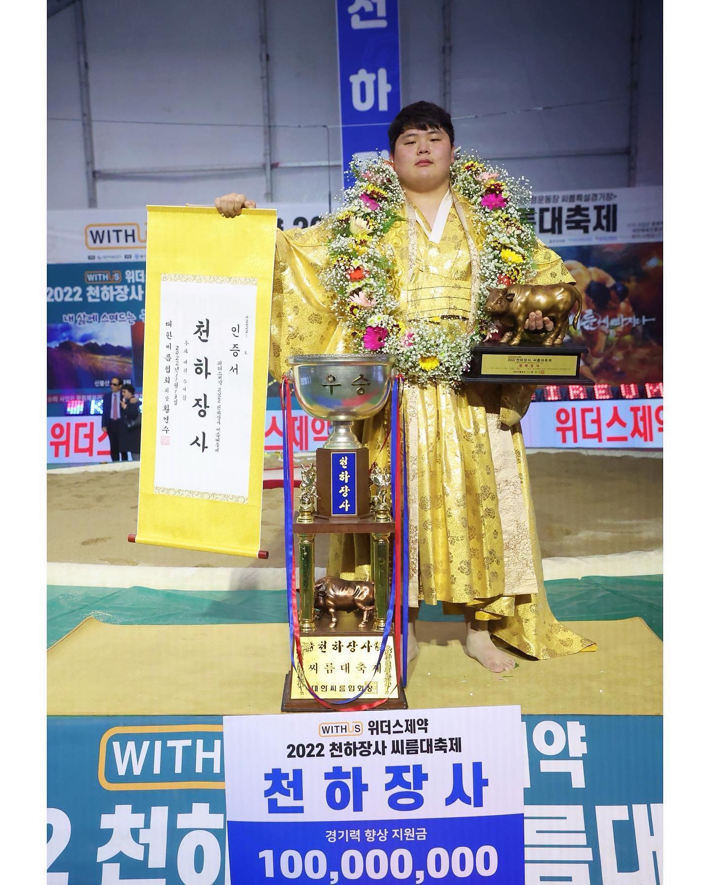 울산대학교 2학년에 재학 중이던 2022년 6월, 단오장사 씨름대회에 출전해 백두장사에 올라 모래판에 파란을 일으켰다. 2022년 11월 13일에 열린 천하장사 씨름대축제에서 8강부터 결승전까지 단 1판도 내주지 않은 압도적인 실력을 뽐내며 생애 첫 천하장사에 등극했다. 대학생 신분의 선수가 천하장사 타이틀을 거머쥔 건 1985년 경남대학교에 재학하던 이만기 이후 무려 37년 만의 일이다. 2022년도 민속씨름대회에서 무패[2]를 기록했다.